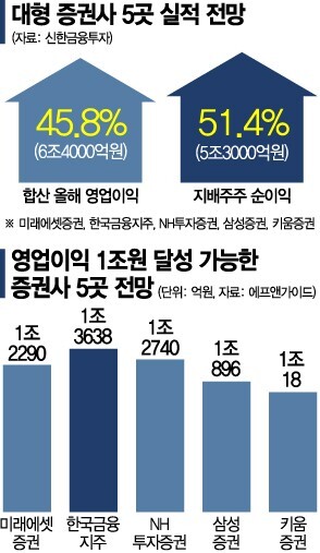 30일 금융정보업체 에프앤가이드에 따르면 올해 1조 클럽에 진입할 가능성이 큰 증권사로는 미래에셋증권(1조2290억원)과 한국금융지주(1조3638억원), NH투자증권(1조2740억원), 삼성증권(1조896억원), 키움증권(1조18억원) 등이 꼽힌다.지난해 국내 증권사 중에서는 최초로 1조 클럽에 진입한 미래에셋증권을 제외하면 4개사가 새로 합류할 가능성이 큰 것이다.