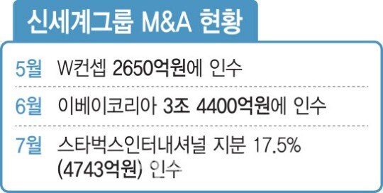 두 달 후인 3월에는 네이버(035420)와 2500억원 규모의 지분 교환에 나섰다. 이마트가 1500억원, 신세계는 1000억원 규모로 각각 네이버와 상호 지분을 교환하며 양사 전략적 제휴 관계를 다졌다. 4월에는 이마트 자회사인 SSG닷컴이 국내 온라인 편집샵 2위인 더블유(W)컨셉을 2650억원에 인수하며 열기를 지폈다. 신세계그룹이 다섯 차례 투자를 통해 자본시장에서 풀어낸 돈만 4조4648억에 육박하는 상황이다.