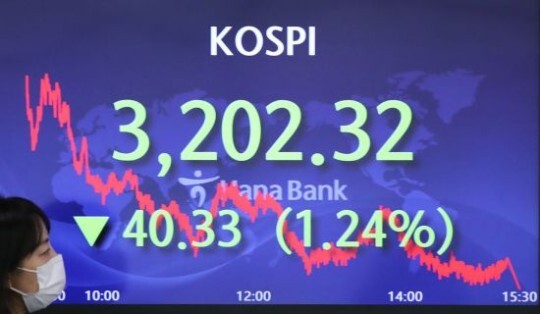 31일 한국거래소에 따르면 30일 코스피는 전날 대비 1.24% 떨어진 3202.32로 마감했다. 지난 5월28일 이후 종가 기준 최저치다. 지난 6일 기록한 종가 기준 사상 최고치 3305.21과 비교하면 3.12%가량 하락했다. 약 두 달간 이어진 3200선이 무너질 위기에 처한 것이다.
