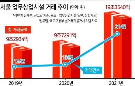 30일 헤럴드경제가 밸류맵에 의뢰해 국토교통부 실거래가공개시스템 자료를 분석한 결과, 올해 1~6월 서울의 업무상업시설 거래는 2145건 체결된 것으로 확인됐다. 지난해 같은 기간(1363건)보다 57.4% 늘어난 것으로 상반기 기준 역대 가장 많은 수치다. 빌딩 거래량이 급증했던 지난해 하반기(1982건)와 비교해도 상승했다.