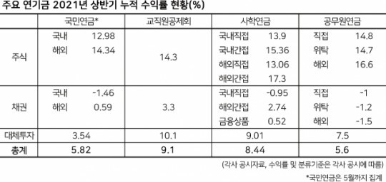[헤럴드경제=이세진 기자] 풍부한 유동성을 바탕으로 이어진 국내외 주식시장 강세에 올해 상반기 주요 연기금들이 높은 수익률을 이어가고 있다. 글로벌 금리 급등으로 채권 수익률은 다소 주춤했지만 원달러 환율 상승으로 성적을 일부 방어했고, 부동산·기업금융 등 대체투자 부문도 선전하며 올 하반기까지 높은 수익률을 예고하고 있다.